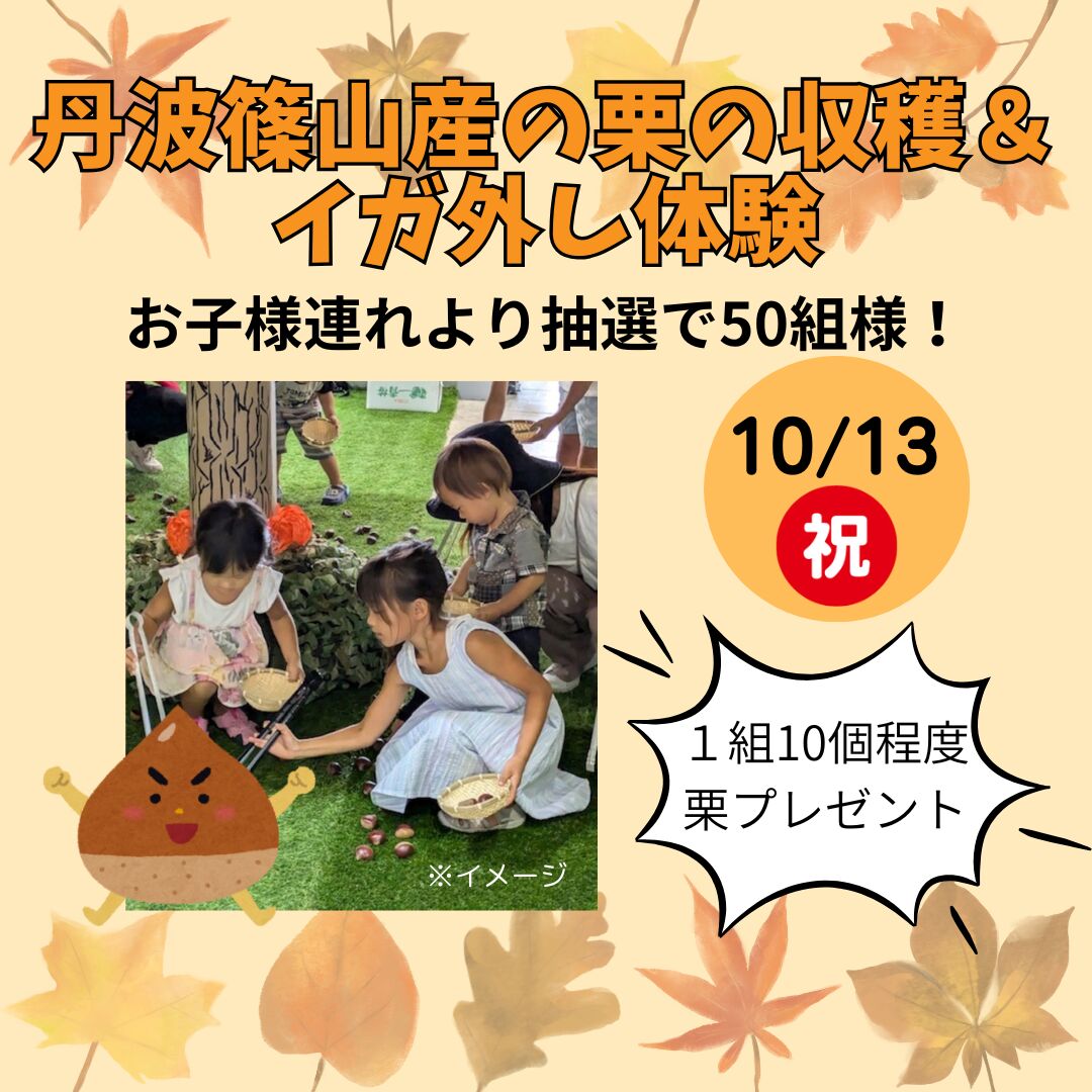 お子様連れのご家族より抽選で50組様に丹波篠山産の栗の収穫とイガ外しを体験していただけます。