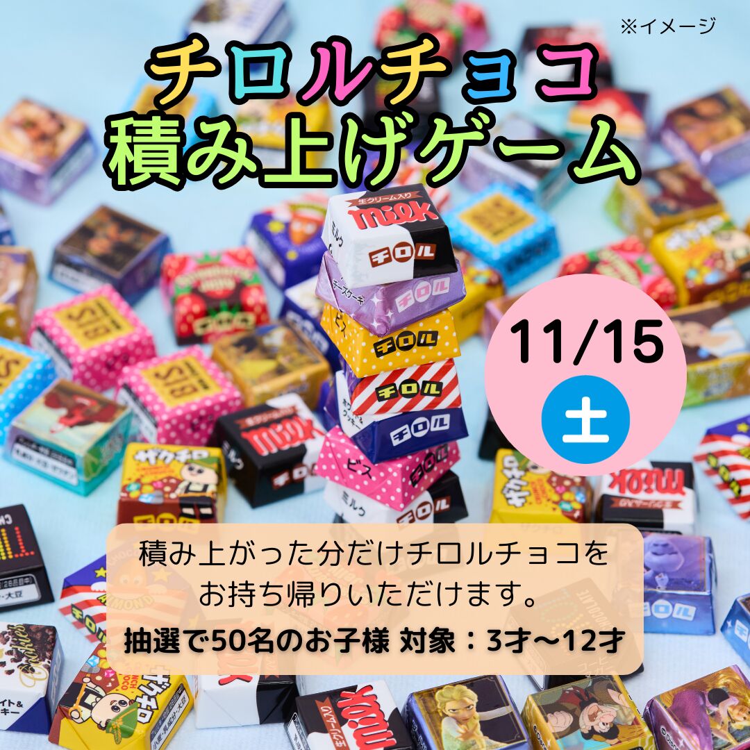抽選で50名のお子様にチロルチョコ積み上げゲームで遊んでいただけます。