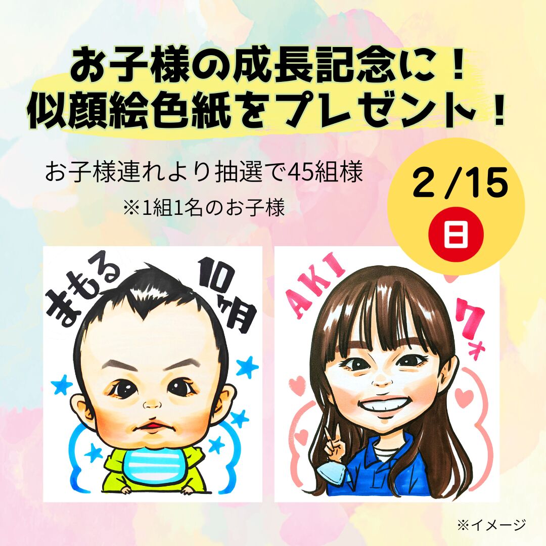お子様連れのご家族より抽選で45組様に、似顔絵師による似顔絵をプレゼントいたします。