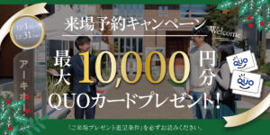 【ご来場予約】QUOカード最大10,000円プレゼントキャンペーン開催中!12/31までの期間限定のキャンペーン!この機会にぜひ、ご来場くださいませ!