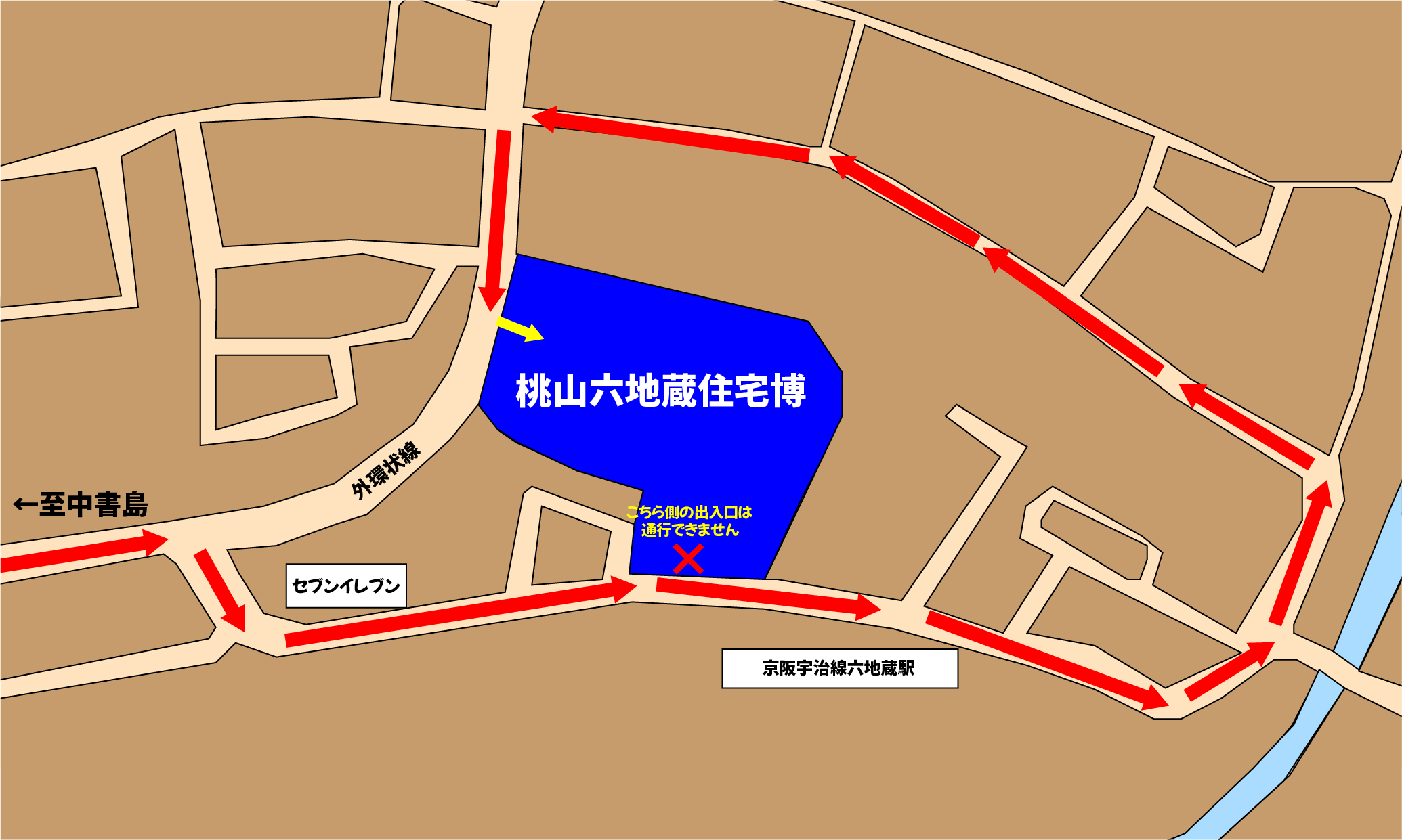 中書島方面からお車でお越しの場合は、下図のルートで迂回の上、左折でのご入場をお願いいたします。